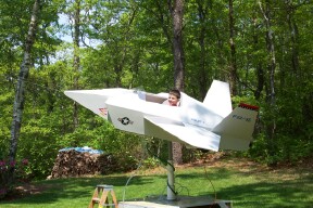 Other features include a retractable landing gear, a nose water cannon, a realistic instrument panel with heads-up display and a larger cockpit for kids up to 100 lb. You will wish you could fly it too! Note: A large styrofoam glider makes a great gunnery target. The lift cylinder may be mounted on an aircraft carrier type deck as shown or on the ground (requires a 6" dia. x 15" hole).