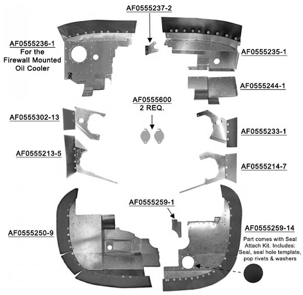 Airforms engine baffles are FAA-PMA approved for Cessna, Piper, Beech, Mooney, and Grumman6061-T6 aluminum available as bare aluminum or gray powder coat finish