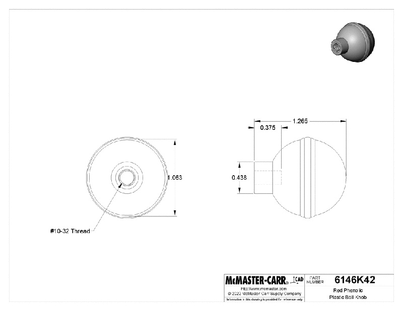 Install these traditional, easy-to-grip ball knobs on a threaded stud. They're good for control levers and push-pull rods. Plastic knobs are a lightweight alternative to metal. They resist oil, grease, and solvents. Phenolic has good scratch resistance. |
