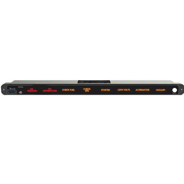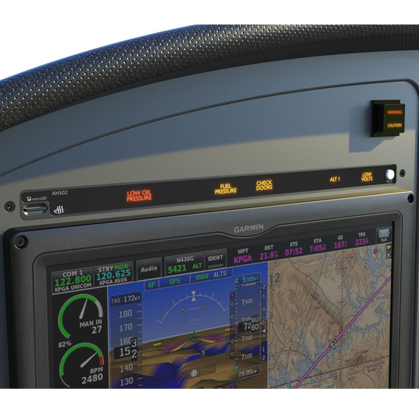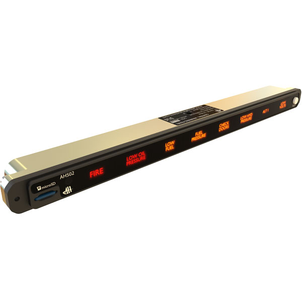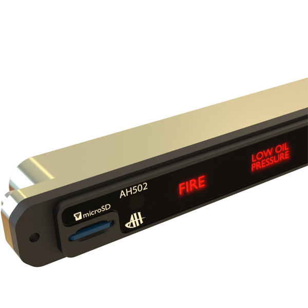 The AH502sd combines flight, engine and aircraft configuration data to generate voice and visual alerts. The unit is programmed to warn off against switched, analog and EFIS data inputs based on the switched state, value threshold or combinations of inputs to generate envelope alarms. Envelope alerts could include oil pressure profiles, speed/ configuration envelopes, gear not down and oxygen alerts. Data is gathered from directly connected switches and analog inputs as well as being able to take flight and engine data from Electronic Flight Information Systems (EFIS) and Engine Monitors when available via serial buses. Alerts are mapped to custom voice and/or sunlight readable and auto dimming captions with integration to a remote Master Caution, Master Warning and alert acknowledgment switch. The front mounted SD card allows for easy adjustment of programming and voice files. |