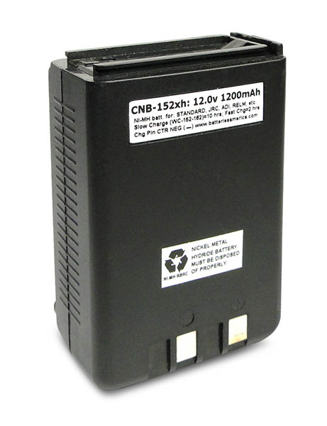 The CNB-152xh is a 12 volt 1200mAh LONG LIFE Ni-MH rechargeable battery pack for STANDARD, ADI, JRC, Heath, & Relm radios. Replaces original #s CNB242, CNB244A, CNB-152, RBP-120, etc. Re-charges via plug-in wall charger, or via Desktop drop-in quick charger. Battery is 3" tall; slides onto bottom of radios. Fits following models: STANDARD C228A, C528A, C558A, C628A; ADI HT201, ADI 201, ADI HT401, ADI 401; JRC JHP-500, JHP-520; others. |
