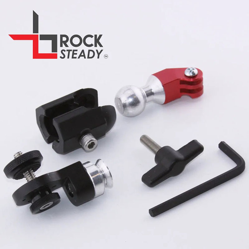 The Rock Steady GoPro style ball mount is the durable and versatile low-profile design that you have been looking for. Unlike plastic mounts, this quality all-metal mount will not move, bend, or fail. The metal GoPro adapter is compatible with any GoPro-style camera. This unique GoPro adapter allows more motion than any other GoPro adapter. The knuckle clamp attaches to any Rock Steady base. The ball and socket adjust a full 360 degrees and then lock your camera into position with a clean hex drive screw or by hand with an included T-handle screw. Buy multiple Rock Steady bases to add numerous quick-change mounting locations at an affordable price. Compatible with all GoPro cameras, Garmin Virb XE, Ultra 30, Virb 360, or any GoPro-style camera. Rock Steady Tie Down Ring Base With the Rock Steady Tie Down Ring Base, quickly turn any standard tie-down ring into a camera mount. This clamp can be easily tightened by hand, making it an FAA-compliant temporary mounting device. The thumb screw hex drive head allows you to tighten it with the included hex wrench too. The aluminum taper nut allows quick attachment to any tie-down ring. This tie down ring base is compatible with all Rock Steady mounts. Note: Device Holders Sold Separately. |