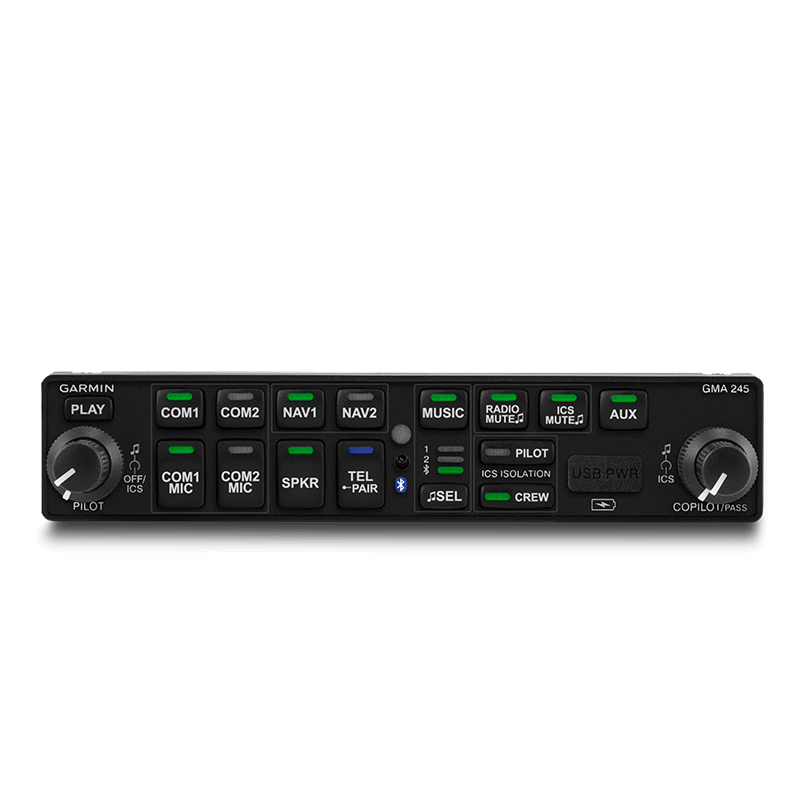 Featuring Bluetooth wireless connectivity, 3D Audio processing, clearance playback and impressive audio mixing and distribution, the GMA 245 audio panel represents the most advanced audio control technology Garmin has ever introduced for experimental amateur-built (EAB) and light sport aircraft (LSA) cockpits. Upgrading from the popular GMA 240 and GMA 340 audio panels in experimental aircraft has never been easier; simply slide in and fly away with the most modern audio processing capabilities available. Seamless Integration with G3X Touchbr> Designed by our dedicated “Team X” engineering group specifically for the experimental market, GMA 245 offers an impressive array of features previously available only on high-end audio systems. Yet, it’s priced to fit the budgets of most kitplane builders and sport pilots. It’s also the perfect complement to our G3X Touch™ electronic flight display systems, enabling pilots to use their choice of conventional knobs and buttons on the audio panel faceplate — or onscreen selection with the G3X Touch displays — to optimize their cockpit communications options. The Benefits of Bluetoothbr> Built-in Bluetooth connectivity with GMA 245 enables pilots to connect the unit with their smartphones or other compatible devices, so they can make and receive calls in the cockpit as well as stream audio entertainment through their mobile devices to pilot, copilot and passenger headsets. When incoming calls are received, visual and aural cues are provided — with onscreen notifications available on G3X Touch to let pilots know who’s calling. Access to Bluetooth-enabled telephone or music inputs can easily be routed to up to 6 headset positions throughout the cabin. In addition, hard-wired sources, such as SiriusXM® satellite radio, DVD or CD players, can also be connected and distributed through GMA 245. Awesome Audio Effectsbr> Think high-end music equalizer and exceptional “home theater” quality sound. That’s what the GMA 245 audio panel brings to inflight media and entertainment. The audio panel provides support for 2 dedicated stereo music inputs — plus additional Bluetooth wireless devices — which can be played through the headsets. Music features allow pilots to select enhanced bass boost levels as well as equalizer effects that include rock, classical and pop audio profiles. Listen in Virtual 3-Dbr> Sophisticated 3D Audio processing in GMA 245 adjusts audio in the headset to approximate how the human ear normally hears and registers sounds in space. This makes it seem as though different audio sources are coming from different directions around you, making it easier to distinguish 1 source from another — and helping you focus on the higher-priority calls coming into your headset. For example, COMM 1 will seem like it’s coming from the left while COMM 2 will seem to be coming from the right. Capture that Clearancebr> One of the most useful Garmin audio features ever invented, an automatic digital voice recorder on GMA 245 continuously captures the last 60 seconds of incoming active comm audio for instant playback on request. Any pilot who’s ever missed an ATC call, frequency assignment or clearance amendment will appreciate the value of this handy “say again” function. Let's Talk Auto Squelchbr> As a further enhancement to the cockpit audio experience, advanced Auto Squelch technology automatically adapts GMA 245 to a quiet or noisy environment without clipping words or cutting out during conversation. A high-performance digital signal processor constantly monitors ambient noise level and automatically adjusts the mic squelch level required to keep intercom conversation as comfortable and natural as possible — whether you’re talking over engine noise in flight or quietly going through your engine pre-start checklist on the ground. Some other audio panels are typically set to work best when the engine is operating and cockpit noise is at its highest, which, in turn, requires you to talk loudly on the ground prior to engine start for audio voice activation. GMA 245’s advanced Auto Squelch technology eliminates these inconsistencies, allowing you to speak at normal levels, no matter what the ambient sound conditions may be. Capability in Spadesbr> At full capacity, the GMA 245 audio panel will support dual comm, dual nav and multiple aux receivers, totaling up to 7 radios in all. There’s a 6-place intercom with 3 modes of isolation. And a split-comm mode lets the pilot and copilot broadcast on independent frequencies. Large LED-illuminated buttons on the panel unit provide intuitive audio and mode selection. Push-to-talk indication is provided by a flashing LED on the face of the unit. Wireless connectivity via Bluetooth for the Garmin VIRB® XE action camera (sold separately) gives pilots the option to overlay intercom audio and ATC communications onto the HD video soundtrack. A Superior Audio Experiencebr> Given such extensive audio control capabilities, GMA 245 clearly raises the industry standard for communications flexibility, hi-fi sound quality and wireless Bluetooth access in today’s ever-more-connected experimental/light sport cockpits. It’s the ultimate “nerve center” for pilots who want the absolute best from their inflight audio environment. The Bluetooth® word mark and logos are owned by the Bluetooth SIG, Inc. |