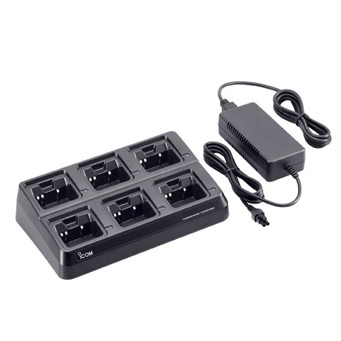 Six unit charger for radios with the BP232N/H Li-Ion battery (includes AC adapter and cups installed); 100-240V with Euro style plug. |