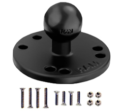 The RAM-B-202-G1U RAM marine grade aluminum base contains a 1 inch diameter rubber ball connected to a flat 2.5 inch diameter base. This mount has pre-drilled holes, including the universal AMPS hole pattern. The connection hardware, which will connect to many different cradle types (see below). |