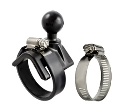 The RAM-B-108BU accommodates rails from 1.0 inch to a maximum of 2.1 inch in diameter. To mount the RAM-B-108BU base, place the saddle shaped plate on the rail then wrap the metal clamp strap around the rail and plate. Tighten the screw knob on the metal strap with a screwdriver until the strap has a firm hold on the rail. |