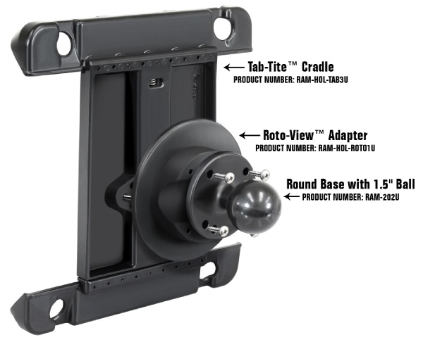 The easy-to-use interface of your tablet makes for a user friendly experience, while on the go. Now you can optimize this mobile experience with the Roto-View™; an adapter plate that allows for adjustment to accommodate many tablet viewing configurations. The Roto-View™ utilizes multiple detents to adjust the tablet to the most popular viewing angles, including landscape and portrait mode. No need to loosen the knob of your double socket arm to reposition your tablet. Instead, simply rotate the cradle to achieve the same result. Compatible with a wide range of tablet cradles and mounts, RAM now offers yet another "easy-to-use" product to help enhance your mobile experience. |
