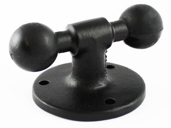 Consists of two 1" diameter rubber balls connected to a post and 2.5" diameter round base. The round base has pre-drilled holes, including the universal AMPs hole pattern and 3-hole 120 degree pattern. The 1" balls measure center to center 2.5" apart. |