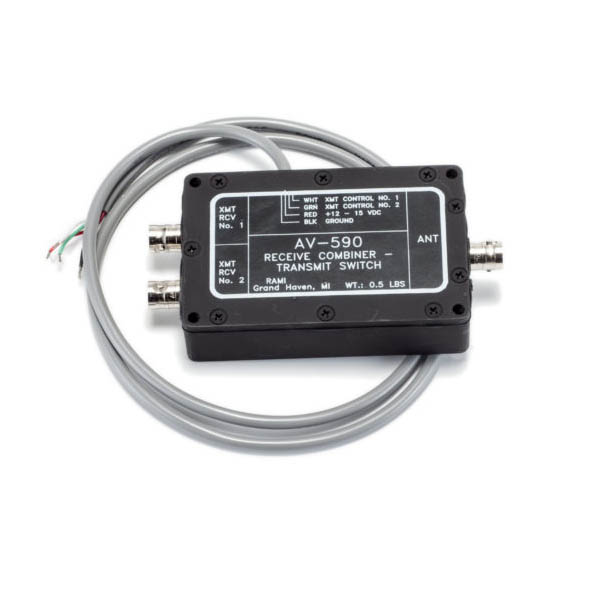 The AV-590 allows two communications radios to share the same antenna. In the nominal, non-switched mode the AV-590 splits the signal from the antenna evenly between two comm radio receivers. When the control voltage is activated by the microphone PTT, the AV-590 switches the antenna to the corresponding radio transmitter and isolates the other receiver.