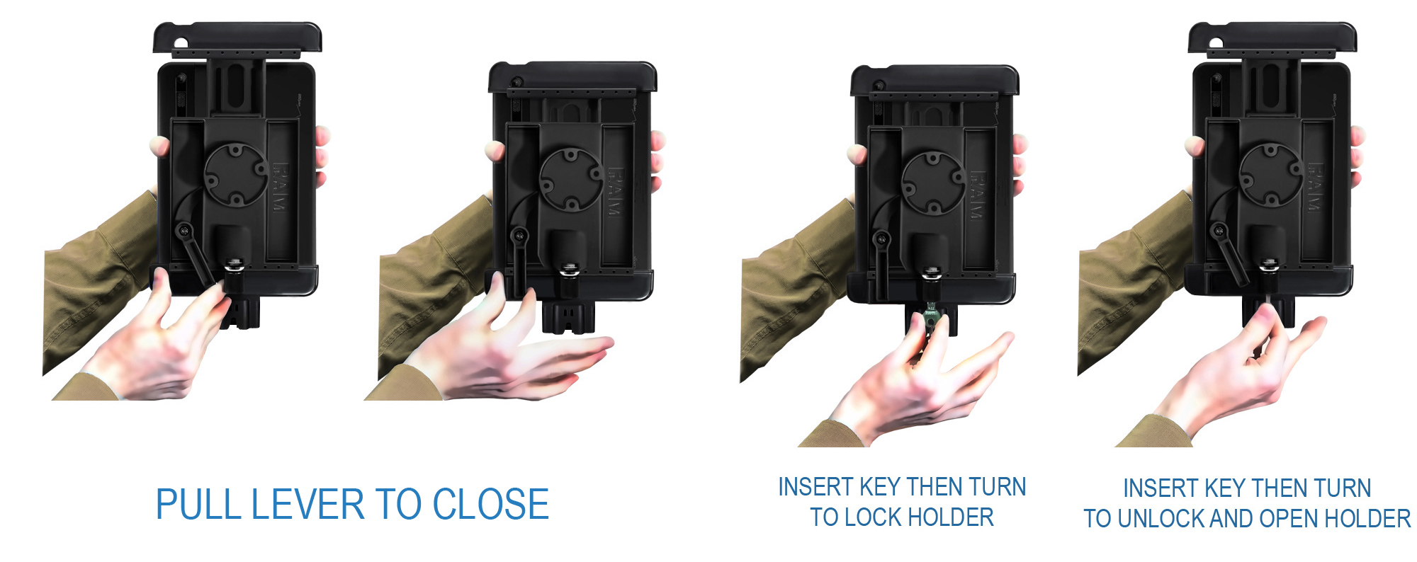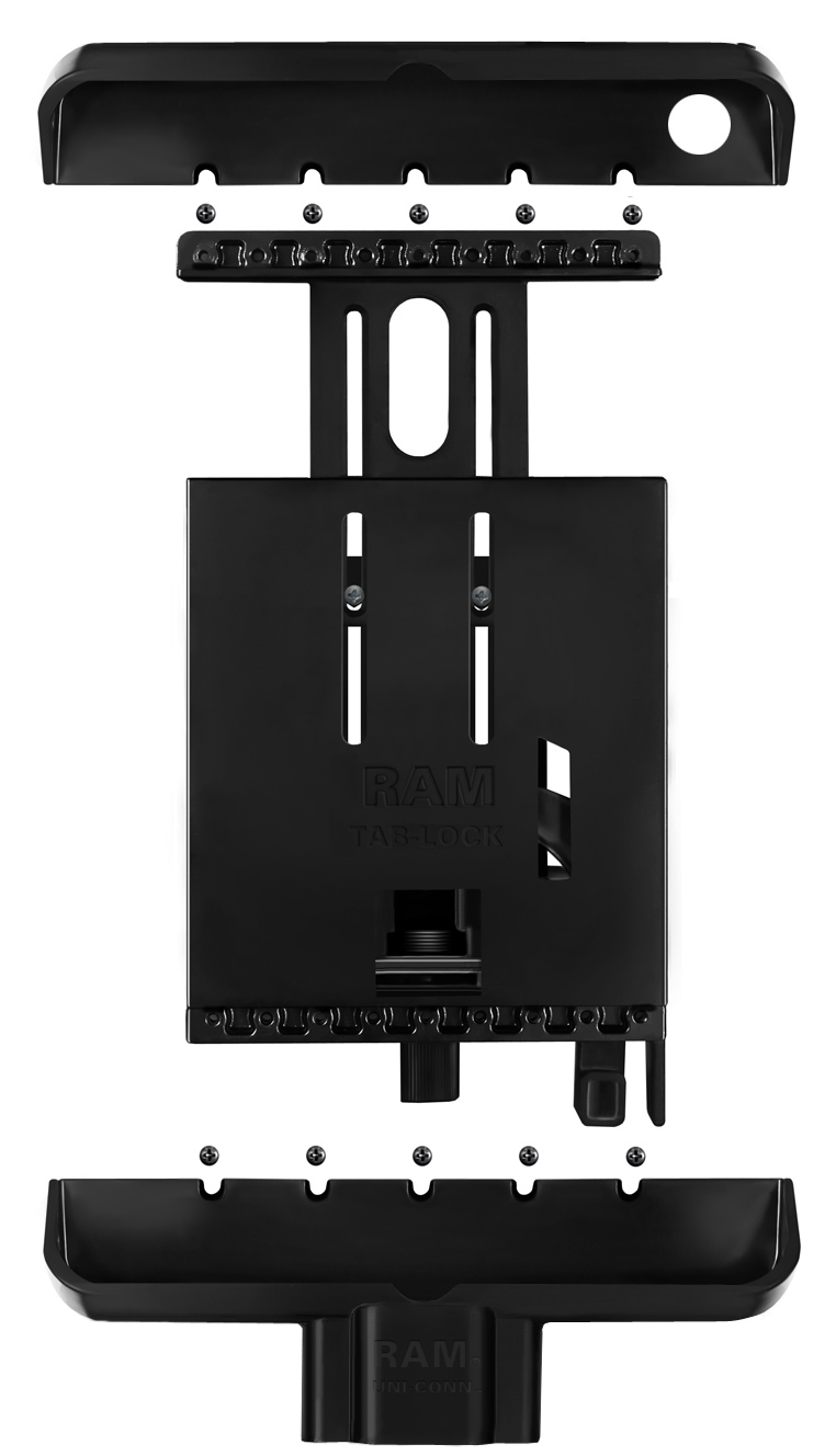 RAM products are renowned for their simple yet effective designs. The new RAM Tab-Lock™ with Uni-Conn™ for the Apple iPadis a perfect example of this. The RAM iPad locking dock features a unique patent pending design which enables the use of the factory iPad cables with docking connector for charging as well as other functions. Also works with most aftermarket cables and or modules with docking connectors. With the vast variety of available cable / docking connector accessories for the iPad you can quickly dock your iPad for charging, line out audio, external GPS antenna and much more. Spring loaded and equiped with a keyed lock, this compact yet durable holder won't take up a lot of space yet provides loads of security. With the new Tab-Lock™ with Uni-Conn™, RAM lets you keep your tablet where it belongs...powered and in your possession. |