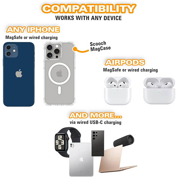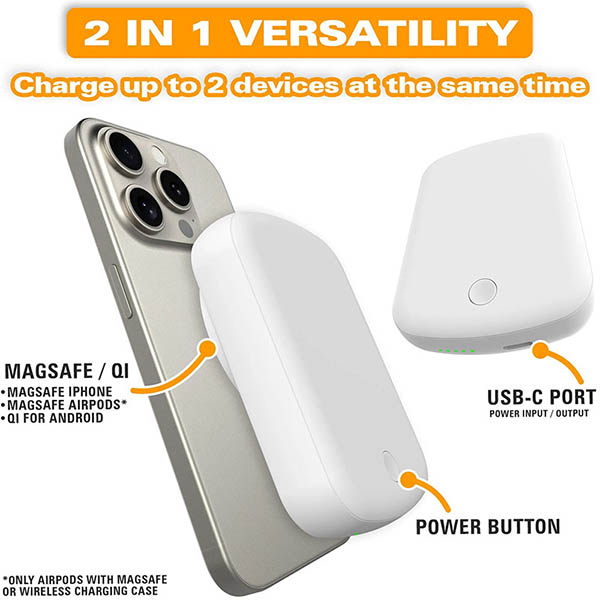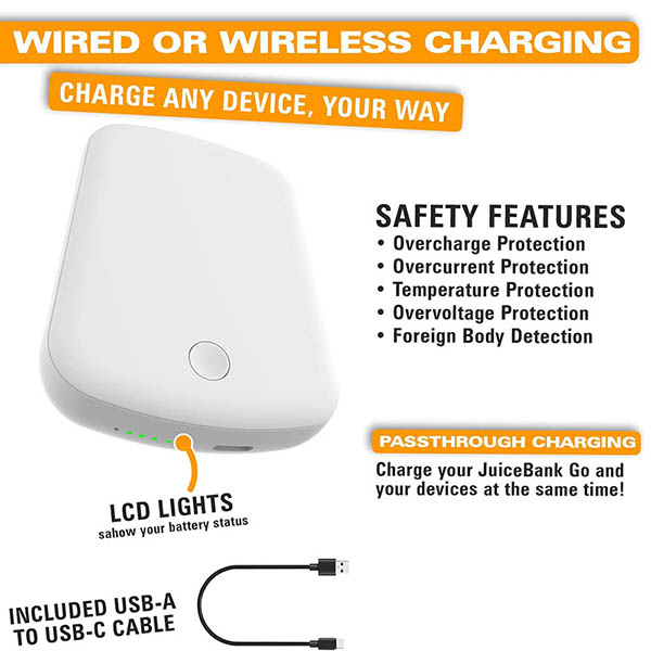 2 IN 1 CHARGING: Equipped with MagSafe wireless charging and a USB-C port, the JuiceBank Go lets you charge two devices at the same time. Perfect for powering your iPhone and another device simultaneously. 10,000 mAh CAPACITY: The JuiceBank Go features a powerful 10,000 mAh battery, providing ample power to keep your devices charged throughout the day. UP TO 15W FAST CHARGING: Delivers fast and efficient wireless charging up to 15W for iPhone 12 and newer, keeping your devices powered quickly and safely. It can also charge other smartphones, including Android, using Qi charging technology. STRONG MAGNETIC CONNECTION: Designed with MagSafe compatibility, the JuiceBank Go ensures a secure and stable fit for uninterrupted charging on the go. USB-C INPUT/OUTPUT: The USB-C port functions as both an input and output, allowing you to recharge the power bank or use it to charge another device with ease. PASS-THROUGH CHARGING: Enjoy the convenience of pass-through charging, which allows you to charge the power bank while also charging your device at the same time. SLIM AND PORTABLE: The compact, lightweight design makes the JuiceBank Go easy to carry in your bag or pocket, perfect for travel, commutes, or daily use. PREMIUM QUALITY: Crafted from durable, high-quality materials, the JuiceBank Go is designed for long-lasting performance. Its matte white finish offers a sleek, modern look while resisting scratches and smudges, ensuring it stays pristine even with everyday use. BUTTON CONTROL: A convenient button on the back allows you to easily check the battery level or turn the power bank on and off. LED BATTERY INDICATOR: A built-in LED indicator shows the remaining battery life at a glance, so you’re never caught off guard. SMART CHARGING TECHNOLOGY: Automatically adjusts power output for optimal charging efficiency and safety. Low power mode is available to safely charge smaller devices like AirPods. SAFETY FEATURES: Built-in safeguards protect against overcharging, overheating, and short circuits, ensuring a reliable charging experience for your devices. |