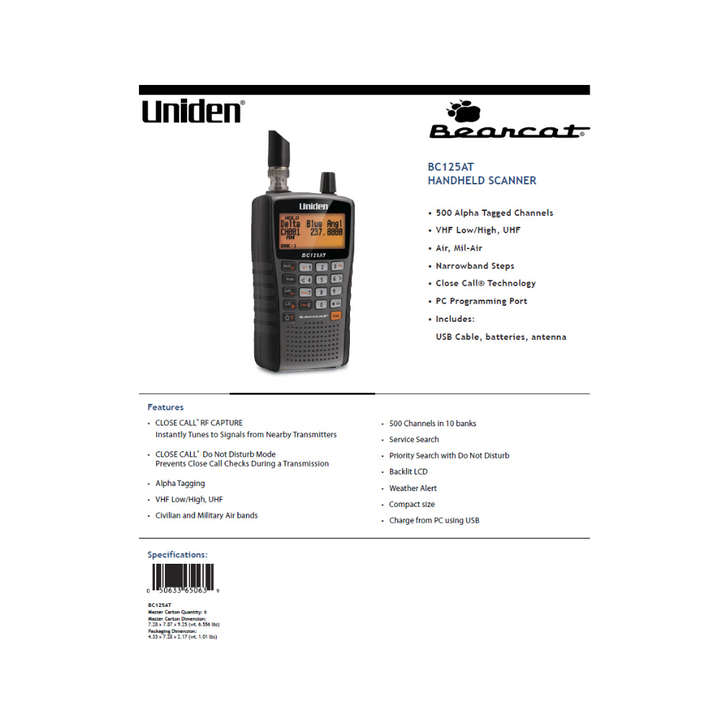 This BC125AT scanner has 500 Alpha-Tagged channels in 10 banks allowing quick access to all civilian and military air bands. PC programmable for quick and easy setup for all your frequencies. The BC125AT covers analog, VHF, UHF, and Narrow-banding. With this Bearcat scanner, you can also receive important weather and safety alerts. The new compact design of the BC125AT is made to comfortably fit in your hand for maximum mobility. Do not be fooled by the new compact design this unit packs a punch of features such as CLOSE CALL RF CAPTURE Instantly Tunes to Signals from Nearby Transmitters, CLOSE CALL Do Not Disturb Mode Prevents Close Call Checks During a Transmission, Signal Strength Meter, Civilian, and Military Air bands and much more. Efficient Searching with 500 Alpha-Tagged Channels