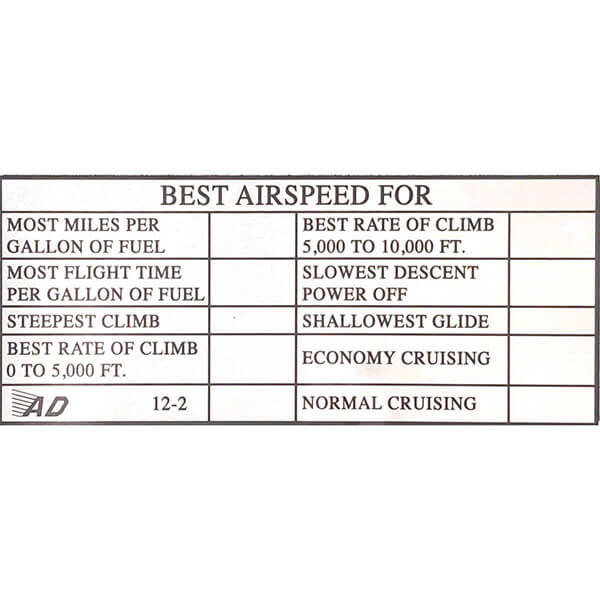 When low on fuel, what speed should you fly the aircraft maximum distance per gallon of fuel? When circling an airport waiting for the ground fog to clear so you can land, what speed should you fly the aircraft for maximum time per gallon of fuel? When taking off, what speed should you fly the aircraft to get the maximum angle of climb to clear high obstacles? This book gives the answers to those questions. Also other critical speeds are given plus how to fly to use less fuel. Each order includes a placard to use to note your aircraft's critical speeds. |