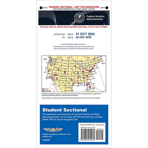 This sectional chart excerpt is for ground training and flight planning practice. An excerpt of the Seattle Sectional, the fold-out chart depicts all classes of airspace and topographical symbols used on the sectional aviation flight planning chart. All sectional legends are included, and the chart is printed to scale and can be used with conventional aviation plotters. Not for use in navigation, this less expensive chart alternative provides the information pilots in training need to learn airspace, flight planning, and route selection. A critical tool for all visual flight rules (VFR) pilots, Sectional Charts are designed for visual navigation of slow to medium speed aircraft. The topographic information consists of contour lines, shaded relief, drainage patterns, and an extensive selection of visual checkpoints and landmarks used for flight under VFR. Cultural features include cities and towns, roads, railroads, and other distinct landmarks. The aeronautical information includes visual and radio aids to navigation, airports, controlled airspace, special−use airspace, obstructions, and related data. Scale 1 inch = 6.86 nm/1:500,000. The Student Sectional is 20.5 x 40 inches, folded to 5.1875 x 10.25 inches. While sectional charts used for navigation are revised every 56 days, this Student Sectional doesn’t expire, making it an ideal addition for ground school courses, learn to fly programs, and aviation STEM classes. |