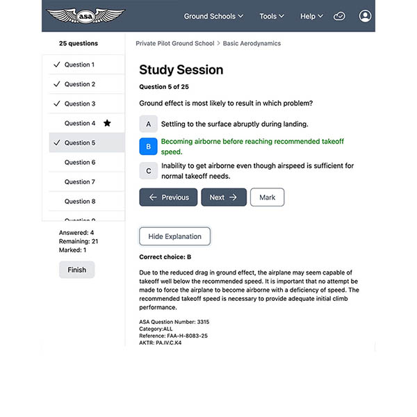 With ASA’s time-tested and trusted content you'll gain the aeronautical knowledge required to become a safe and competent pilot. This convenient on-demand solution is effective for self-study and the organization makes it an easy addition to any Part 61 or 141 instructor-led ground school. Approved for FAA Wings credits, the comprehensive curriculum consists of lessons featuring internet-based evaluation, resources, and course tracking, supported with professional multi-media presentations from the leaders in aviation training. Read: ASA Private Pilot Test Prep (online) and The Complete Private Pilot (online) Watch: ASA Private Pilot Virtual Test Prep…Nearly 11 hours of video presentations Practice: Quizzes, sample FAA questions supported with answers, explanations, and review modes from ASA Prepware Prepare: Take practice tests…obtain your FAA Knowledge Exam endorsement Course Contents: Introduction, Aerodynamics, Aircraft Systems, Flight Instruments, Regulations, Procedures and Airport Operations, Weather, Weather Services, Aircraft Performance, Enroute Flight, Navigation, Communication Procedures, and Test Tips. Also included: on-screen CX-3® Flight Computer, fully-searchable FAR/AIM, and Private Pilot Airman Certification Standards (FAA-S-ACS-6). An internet connection is required to access this course. Complete the Private Pilot Online Ground School on all your internet-connected devices for the ultimate in flexibility. Login from your desktop, laptop, netbook, smart phone, iPad or other tablet computer – the course knows where you left off regardless of which device you last used. Upon completion of the course and practice tests you'll receive your Endorsement letter and Graduation Certificate. Review all lesson components even after completion of the course to serve as a refresher too, with access available for 24 months (after course registration date). |