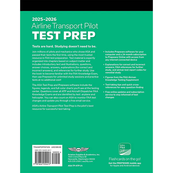 Tests are hard. Studying doesn’t need to be. Join millions of pilots and mechanics who chose ASA and passed their tests the first time, using the most trusted resource in FAA test preparation. Test material is expertly organized into chapters based on subject matter and includes introductory text and illustrations, questions, answer choices, answers, explanations (for correct and incorrect answers), and references for further study. Use the book to become familiar with the FAA Knowledge Exam, then use Prepware for unlimited study sessions and practice tests, and receive your test authorization (endorsement) at no additional cost! The ASA Test Prep and Prepware software include the figures, legends, and full-color charts you’ll see at the testing center. Questions cover all ATP and Aircraft Dispatcher FAA Knowledge Exams and are identified by test: airplane and helicopter. You can also count on ASA to monitor FAA test changes and update you through a free email service. ASA’s Airline Transport Pilot Test Prep is the pilot’s best resource for successful test-taking.