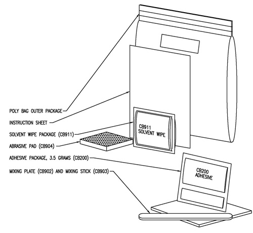 The CB92 Acrylic adhesive & prep material kit includes adhesive package (3.5 grams) mixing plate, mixing stick, abrasive pad, solvent wipe package, and instructions. |