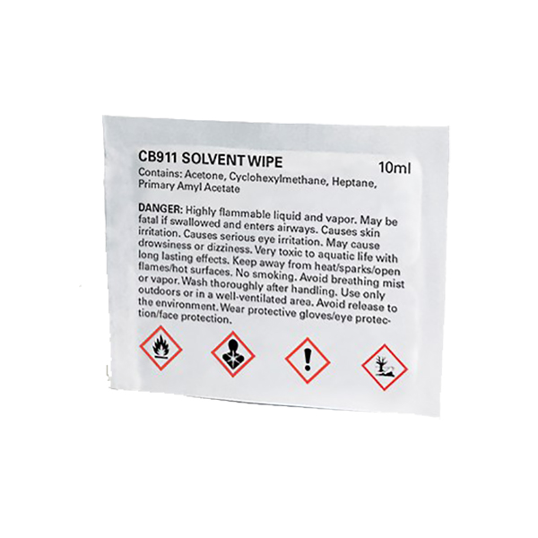 Pre-saturated wipe contains Click Bond recommended solvent blend optimized for surface preparation of metallic and composite substrates and Click Bond adhesive-bonded fasteners. CB911 solvent blend has perfect balance of aggressiveness, material compatibility, and flashoff time to deliver optimal surface cleanliness. |