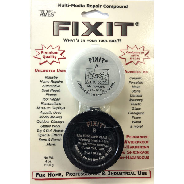 Fix-it is a universal repair compound. It is excellent for rebuilding or fabricating parts and as an all purpose adhesive for wood, metals, ceramic, glass, and many plastics. Fix-it can be tapped or drilled, sanded, filed or painted. Patch holes and cracks and seals leaks. Sets rock hard overnight. Fix-It is non-toxic, non-hazardous, and impervious to fuels and liquids. |