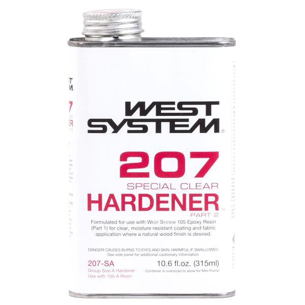West System 207 Special Clear Hardener is formulated for coating and fiberglass cloth application where a clear, moisture-resistant, result is preferred. For fiberglass layups over wood, 207 Special Clear Hardener allows the natural grain of the wood to show through. Other uses include carbon fiber layups where a clear effect is desired. This hardener cures to a light amber color, similar to traditional spar varnish.