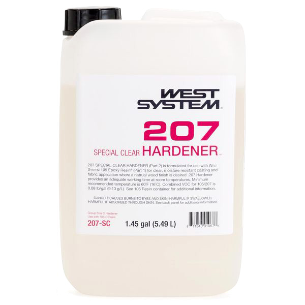West System 207 Special Clear Hardener is formulated for coating and fiberglass cloth application where a clear, moisture-resistant, result is preferred. For fiberglass layups over wood, 207 Special Clear Hardener allows the natural grain of the wood to show through. Other uses include carbon fiber layups where a clear effect is desired. This hardener cures to a light amber color, similar to traditional spar varnish.