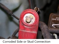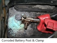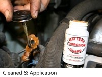 If your batteries and their connections are suffering from corrosion, Battery Corrosion Guard applied to your battery connections - whatever style you have (ie, post & clamp / side mount / stud) - will provide you the corrosion protection you expect. Battery Corrosion Guard works best if you properly clean your connections with a cleaning agent (baking soda and water). Dry all connections before using the applicator brush to apply Battery Corrosion Guard. Battery Corrosion Guard will dry to a rubber-like texture, sealing and carrying its own acid neutralizer to protect your connections. Battery Corrosion Guard will remain intact if undisturbed. With activities such as pressure washing under your vehicle hood or disconnecting your battery terminals, you will want to reapply Battery Corrosion Guard for lasting protection. Warning: Do not use Battery Corrosion Guard in an unapproved manner. Battery Corrosion Guard is not known to be toxic. Not for human consumption. If swallowed or aspirated, immediately contact a physician. Eye contact, flush with water and contact a physician. Contains viscous hydrocarbons. Keep out of reach of children and pets. Corroded Battery Post & Clamp Cleaned & Application Corroded Side or Stud Connection |