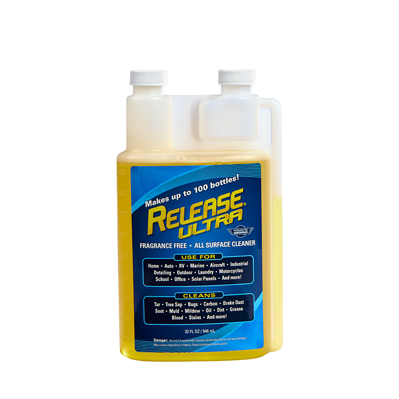 Reach for Release® - The most effective aircraft cleaner and degreaser is safe to use on all surfaces due to its advanced associative technology. No more spot testing, it won’t hurt the surface, period. Release Ultra® is an ultra-concentrated non-solvent base product that is formulated for rapid penetration and removal of dirt, grease, grime, oil, exhaust soot, and organic soils. It will need to be diluted down to a ready-to-use ratio that fits your cleaning needs. Release works by emulsifying the soil and releasing it from the surface, not attacking it. Release® can be used on interiors and exteriors and is fragrance-free, meaning there is no chemical smell.