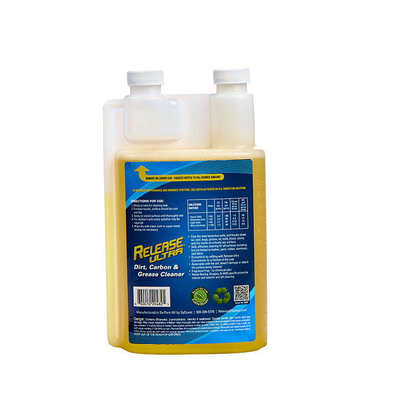 The list of surfaces Release® can be used on is endless, this is because it contains no phosphates or harmful chemicals and is dye free. It even meets AMS, Boeing, and McDonnell Douglas specifications and is approved for use on Textron brands such as Cessna, Hawker, and Beechcraft. You’ll have peace of mind when using Release® that it won’t stain or damage the surface you’re cleaning. You won’t find a better value in cleaning than Release Ultra®. With the ability to refill your container for as low as 21 cents per refill, Release Ultra® is a great cost-effective choice. Syquest products come in recyclable containers, do not use aerosol gasses, and are biodegradable. This is part of our commitment to preserve Syquest's environment and reduce emissions. By purchasing Release Ultra®, we ship less water reducing shipping emissions. It allows ordering fewer products than a normal cleaning concentrate. Do more with Release Ultra®, cut out other cleaning products such as your glass cleaner, interior cleaner, insect cleaner, or even carpet stain remover. |