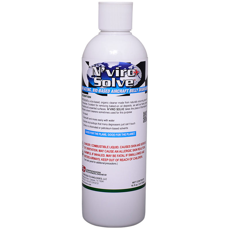 N'viro Solve Fast-acting, bio-based aircraft belly degreaser N'viro Solve is a bio-based organic cleaner made from various plant and fruit derivatives. This naturally occurring degreaser removes baked-on oil deposits, as well as heavy grease, from painted or unpainted surfaces. N'viro Solve will take the place of volatile solvent cleaners sometimes used for this purpose. N'viro Solve is totally biodegradeable when rinsed with water N'viro Solve can be diluted 3:1 with water to dissolve lighter accumulations. For heavier deposits, use product at full strength. Simply spray N'viro Solve on and allow product 30 seconds to penetrate. Wipe and rinse with water. |