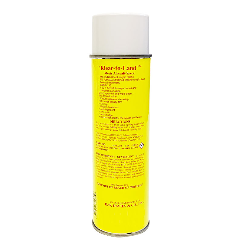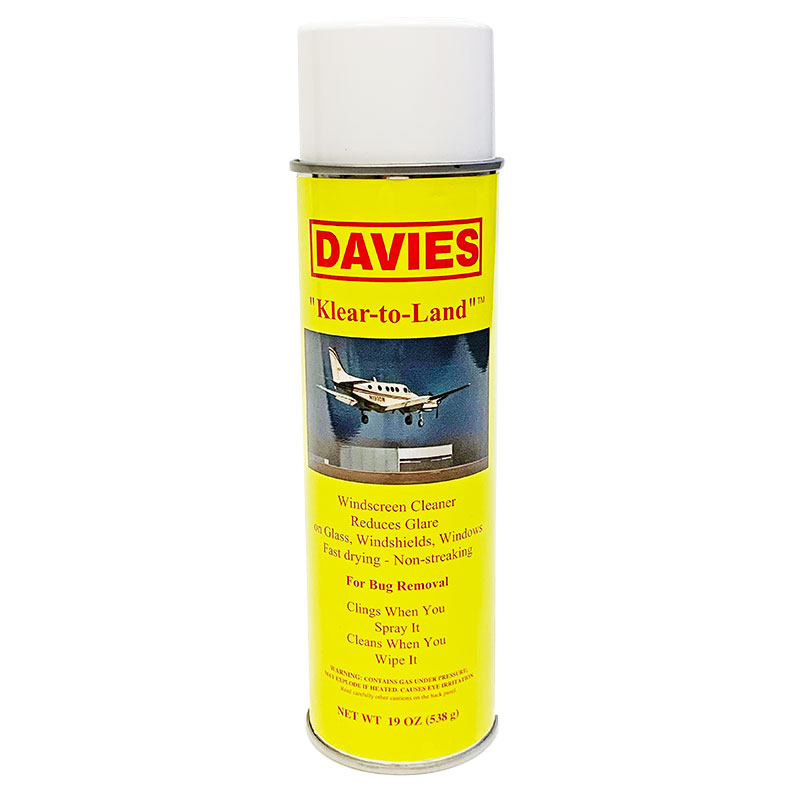 “KLEAR-TO-LAND” is formulated primarily for aircraft windscreens – however, it can be and is used extensively for aircraft interior cleaning, including upholstery cleaning, fabric, plastic and leather. When used as an upholstery cleaner, it is recommended that “KLEAR-TO-LAND” be sprayed on surface and allowed to remain on surface for approximately two minutes allowing the chemical action to penetrate and break up soil – after two minutes of chemical action, simply wipe surface clean. For cleaning windscreens and windows, it is NOT necessary to allow any time for chemical action – recommend to spray and wipe immediately after spraying windscreens since there is no porous surface that needs to be penetrated on windscreens. Maintaining your aircraft windows is not difficult, but there are a few considerations to keep in mind. Although acrylic plastic is considerably stronger than glass, its face is not as hard, so you must use care when cleaning your windows to prevent scratching. Never rub the surface with a dry cloth. Excessive rubbing builds up a static charge on the Plexiglas that can attract dust. Never rub surface with dry cloth and never use any soap or glass cleaner that is not made to aircraft specs - - - it will cause scratching and crazing of windscreen. Never use aircraft deicing fluid on windscreens, as it will cause excessive crazing. Always be sure to use a cleaner made for acrylic plastic, such as Davies “KLEAR-TO-LAND”. Spray on “KLEAR-TO-LAND” liberally; rub well with clean dry cloth. Minor scratches will be greatly improved over a period of time. “KLEAR-TO-LAND” leaves an invisible film giving windscreen much greater slip as well as being an ice deterrent in winter flying. Due to the ‘slip value’ of “KLEAR-TO-LAND”, pilots spray all leading edges of wings to obtain more slip and be a great ice deterrent on all leading edges. |
