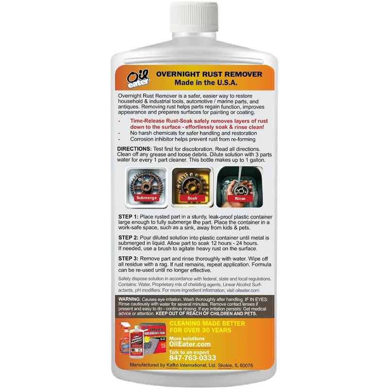 RUST SOAK TECHNOLOGY: Oil Eater’s proprietary Rust-Soak technology safely dissolves rust down to the surface. Great for hardware, parts, cookware, antiques, marine and automotive parts.