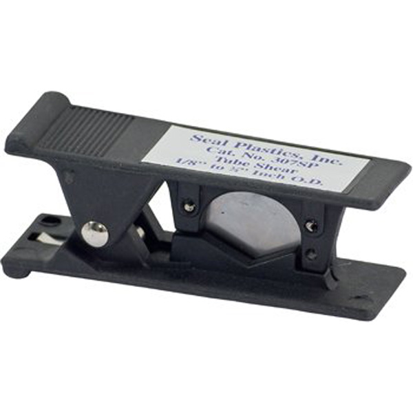 Seal Plastics lightweight tubing shear only 3" overall in length, easily cuts all thermoplastic tubing and other types of non-wire reinforced hose. Its design includes a "blade guard" that offers protection against accidental blade contact, spring-loaded for safety-closes automatically, completely covering cutting edge of the blade, in the additional features raised handle ribs that improve the users' grip. The "Snip", plastic tube and hose shear is a compact tool designed to evenly cut poly-flo tubing. Shear is spring loaded with a replaceable hardened steel blade. |