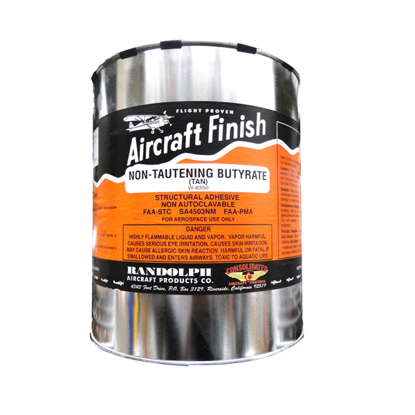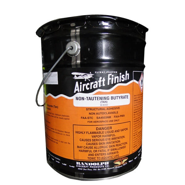 This non-tautening butyrate dope features an increased level of plasticizer and will not tauten excessively. Takes longer to dry than standard butyrates. Tinted. Used to apply finishing tapes. Available in quart, gallon, and 5 gallon sized. Do not mix Certified Coatings dopes and thinners with Randolph products as they are not always compatible. Use all Certified Coatings products or all Randolph products. |
