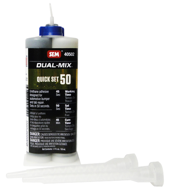 Black, fast curing urethane adhesive designed for automotive plastic repair. With a 50 second work time, an excellent choice for quickly repairing bumper brackets, tabs, headlight buckets and grills. It may also be used for bonding backer panels, moldings emblems and most small plastic, metal and aluminum parts. |