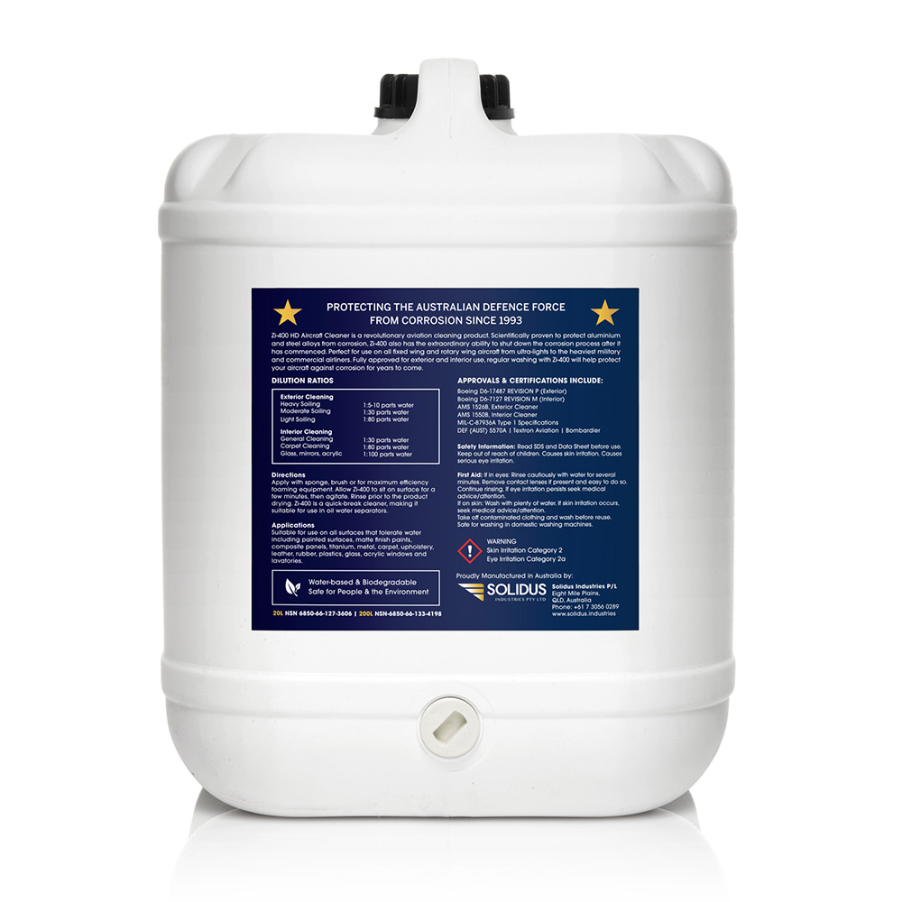 Solidus Industries Zi-400 HD Aircraft Cleaner is a revolutionary aviation cleaning product. Scientifically proven to protect aluminium and steel alloys from corrosion, Zi-400 also has the extraordinary ability to shut down the corrosion process after it has commenced.