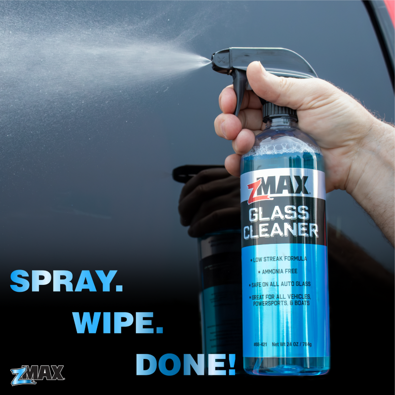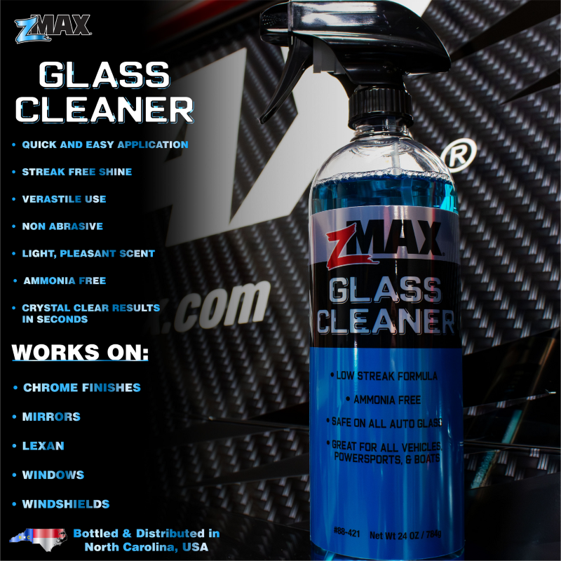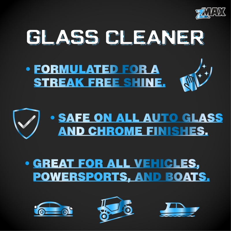 24oz. zMAX Glass Cleaner is specially formulated for a streak free shine in seconds. A quick spray and wipe gets rid of dust, fingerprints, and smudge with ease. Safe on all windows, mirrors, and chrome finishes. Great for Vehicles, powersports, boats, planes, and home. |