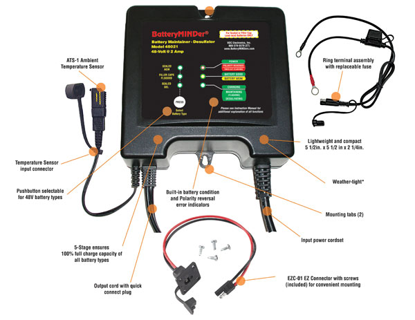 BatteryMINDer® 121068V is a 2 stage charger/maintainer/desufator that extends performance and life of 8 Volt sealed lead acid batteries including flooded (filler cap, maintenance-free, valve regulated lead-acid [VRLA], sealed lead-acid [SLA]), starter, deep cycle and hybrid. It automatically dissolves harmful power-robbing sulfation using safe, low voltage, patented high-frequency pulse technology. Can be left connected for extended, non-use periods without overcharging. Unit can maintain up to four batteries at one time (8 Volt batteries in parallel) when connected in parallel by using SmarTechnology™ Y-Connectors (part# 210AY ) or customer supplied 18-Gauge insulated wire.