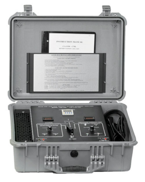 Combination portable charger and analyzer for all types and ratings of Nickel Cadmium sealed or vented Lead Acid aircraft batteries. No Programming Required The CA-1550 CML Charger/Analyzer is a portable or benchmounted self-contained unit for charging and discharging capacity testing aircraft or ground support batteries. It is simple to use and does not require programming or use of a computer. Digital read-outs of volts, amperes and time are clearly displayed. The CA-1550 CML has been designed to accurately charge, test and guarantee the emergency capacity of sealed or vented lead-acid or nickel-cadmium batteries. Guaranteed emergency capacity is especially important for aircraft batteries. Wide Variety of Use The unit comes in a convenient protective carrying case. The flexibllity of charge and discharge functions of the CA-1550 CML makes it usable for a wide variety of batteries. The unit accurately charges and tests 12 or 24 volt lead-acid batteries as well as nickel-cadmium batteries from a single cell to 22 cells. Charge and Discharge The charge section of the CA-1550 CML allows charging at both constant potential or constant current to give maximum flexibility in selection of charge method. The charger has an adjustable charge current from 0 to 25 amperes, and an automatic times to read and/or terminate charge and discharge time. The discharge section of the CA-1550 CML enables battery capacity testing with a constant current of 0-50 amperes. The unit automatically measures the battery voltage and passes or fails the battery depending on the battery’s ability to maintain the specified minimum voltage for the pre-settable time, (usually one hour). All meters “freeze” their readings at the end of test and the operator thereby knows the precise ampere hour capacity of the battery. The CA-1550 CML will then recharge the battery after the cap test. |