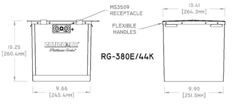 The RG-380E/44K is a Concorde Platinum Series Aircraft Battery. The Platinum Series is comprised of premium hand made AGM Aircraft Batteries with excess power for many applications. RG-380E/40K is a fire resistant powdered coated aluminum container with side louvered vents and matching cover with fabric lifting straps and hold down bar.