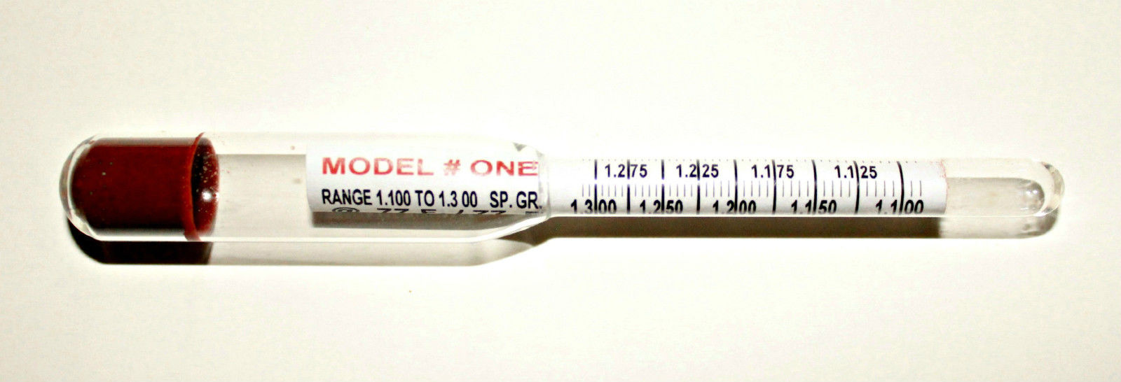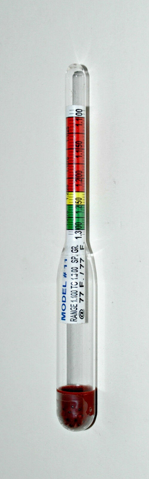 Made by Freas, Conshokocken PA, in the USA. Manuf since 1926. I have used Freas hydrometers since 1974 and Freas is the best. Comes in an unmarked wholesale box. INSRUCTIONS ( from an old retail box in the hangar) TO ASSEMBLE: Put the hydrometer in the barrel, thin end first. Then wet the plug and push it in barrel up to ring, and the instrument is ready to use. HOW TO USE Hold the instrument in a vertical position, compress the bulb and insert the nozzle as far as possible in the electrolyte gradually lesson the pressure on the bulb until the electrolyte rises in the barrel enough to float the hydrometer about 1/2 inch. The reading on the instrument must be taken when there is no compression on the bulb at the surface of the electrolyte. ( NOTE: this means you will need to extract the tip from the battery to let any remaining air out of the bulb) The specific gravity of the electrolyte is an indication of the amount of charge in a battery. When the battery indicates 1300 on the hydrometer at full charge, and after the battery has been in use and the hydrometer indicates: 1250 70% of charge 1225 50% 1200 40 % 1175 20% When 1150 the battery is exhausted and must be recharged. NOTE BY COMMENTER: An auto battery starts out at 1300 specific gravity. The best I have ever seen a Gill wet battery is about 1285 when new and fully charged. Save some of the Gill electrolyte shipped with a new battery to use as a reference test of the hydrometer. Freas test point is set at 80 F to match the Gill specs for 1285 sg. Go to Gill website to download their battery manual for variations is specific gravity from 30 F to 120 F.