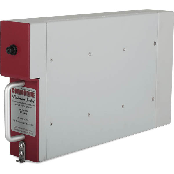 Monobloc replacement only, original battery required. The RG-150-2 is a Concorde Platinum Series Aircraft Battery. The Platinum Series is comprised of premium hand made AGM Aircraft Batteries with excess power for many applications. The RG-150-2 is an ARINC rack mountable aircraft battery. Avionics Battery for lighting, standby, emergency power. Protects and extends the life of other avionics. Concorde Emergency Batteries float directly on the DC buss with no need for a dedicated charger. This results in a high inrush current which extends battery life with fast recovery time from discharge. With the battery floating directly on the buss, transient spikes in the DC power are absorbed. These batteries are self regulating on charge and will take only the current required to maintain it at full charge. Recombinant Gas - The RGŪ Series are low resistance, valve regulated lead acid (VRLA) batteries.