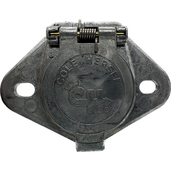 Cole Hersee 11041 Piper type external power connector socket. Self-grounding, single pole. Diecast housing, spring-loaded door. Solid brass contact, 3/8” (9.5mm) diameter, with insulated tip to prevent short circuits. Rubber boot protects terminals and connections. Accepts up to 0AWG cable. Fits 2” (50.8mm) diameter hole. Flange holes 21/64” (8.6mm) diameter, 2 15/16” (74.6mm) on centers. Mates with 11042 plug. |