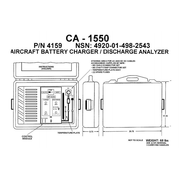 Combination portable charger and analyzer for all types and ratings of Nickel Cadmium sealed or vented Lead Acid aircraft batteries. |