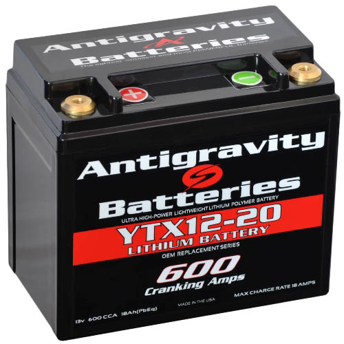 This is the second most powerful battery in the Antigravity Baterries line up. At a massive 600 Cranking Amp and extremely compact size 5.8" Length x 3.4" Depth and 5.12" height (to the top of battery) this battery offers the great power in the smallest package you can find for motorsports. This battery is best used for applications where extreme POWER in an ultra compact size are desired such as Large V-Twins Motors, Touring bikes, Adventure Bikes and Race Cars. IT comes in the OEM YTX12 case format so it fits many motorcycles and powersports vehicles with a drop in fit. Due to its compact size it can also be used in all V-Twins or applications where the most power is desired in the smallest package possible. Great for Race Cars also. |