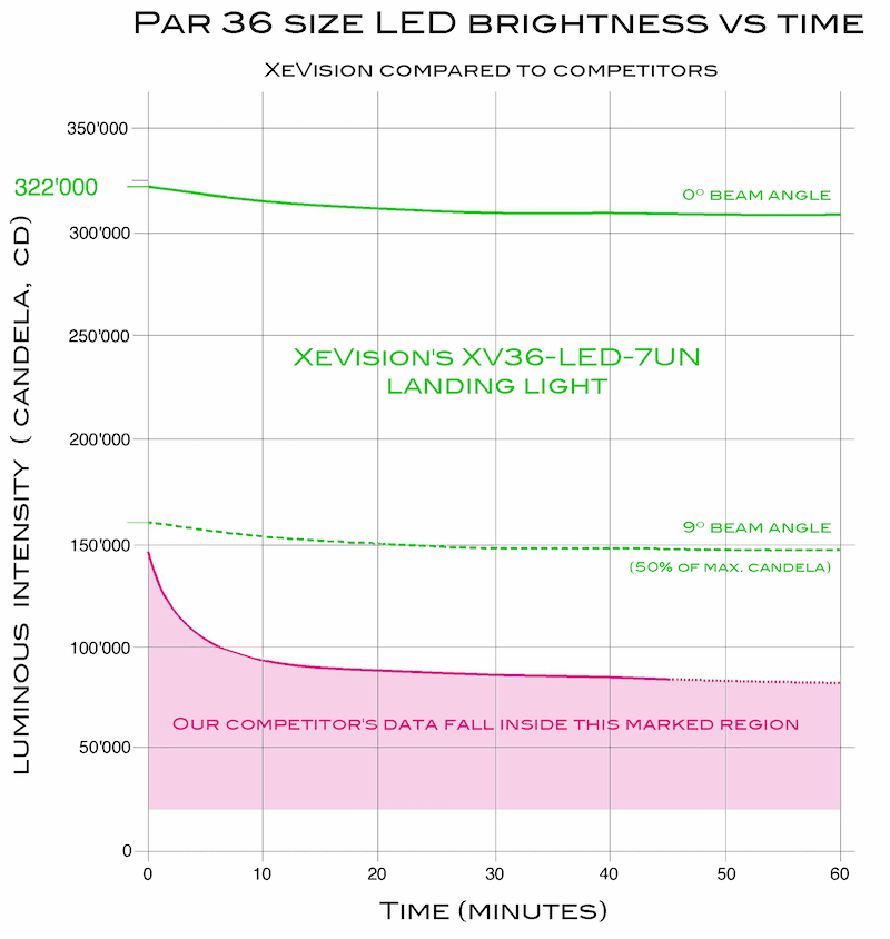 By out-of-the-box thinking, XeVision has achieved efficient and dependable extreme brightness for LED "light engines", with certified and published Lab measured outputs greatly exceeding anything currently on the world market (see above, the documented performance comparison graph photo). High-power LEDs inherently generate a lot of heat while in operation. The excess heat needs to be dissipated quickly, otherwise, the system may suffer a possible thermal run-away which dramatically lowers the LED output, and lowers the LED lifespan, which in the worst case may even destroy the LED. Common solutions for LED lights are implementing passive heatsinks to address this adverse effect, however, usually not efficient enough. To avoid damage to the LEDs in those LED lights, the power to the LEDs is reduced by an electronic safety circuit with the negative result of significantly reduced brightness. In contrast, XeVision® opted for a very effective Active Cooling approach. XeVision's proprietary active cooling design guarantees sustained highest light output and long component life by a meticulously designed cooling concept starting at the LED to substrate level, selecting low thermal resistance materials and TIM (Thermal Interface Material), and ending with a fan supporting pin fin heatsink very efficiently dissipating heat to the ambient air. For the advanced high-efficiency design concept, XeVision selected state-of-the-art high-power LED chips and optimized TIR optics together with a protective high visible light transmission hardened AR (anti-reflective) glass. After several years of development and extensive testing, we established that the light fixtures were producing more than 96% of brightness even after days of continuous operation under ambient conditions, around 25ºC. Fixture and heatsink temperatures stayed well below 60ºC thanks to our proprietary no-compromise active cooling design for the LED light engine including the supporting control electronics. The XV36-LED-7UN LED landing light is an extreme powerhouse in regards to luminous intensity and a benchmark for a lamp with a par 36 form factor generating > 320'000 cd (Candela / Candle Power) of light at 100 W power input, more than double what the closest competitors currently claim for initial output. The landing light easily reaches 800 m (1/2 mile) of range at a comfortable 9.5 degree primary beam angle, 15+ degrees useful Field Angle. The visible areas are quite uniformly illuminated allowing excellent clarity of view. The size and range of the beam pattern are a good match for both fast and slow landing aircraft. This landing light beam is also quite effective for taxing purposes. The light’s High intensity XeTREME power provides a great enhancement for "See and be seen" during all phases of flight. XeVision's proprietary strobe mode, dubbed XeStrobe™, is purposely designed by their engineers for better recognition. The XeStrobe™ pattern and high brightness light beam of this LED landing light is a perfect solution to mitigate bird strikes. Used together with the LED taxi light version, the wider taxi projecting angle helps to reach flocks of birds over a wider range. By using both Landing and Taxi fixtures with the XeStrobe™ pattern selected “To be seen” is a no-brainer even for birds. XeStrobe™ is far superior to the traditional wig-wag pattern. |