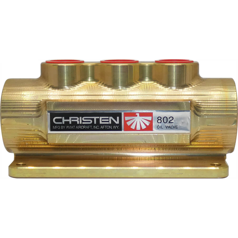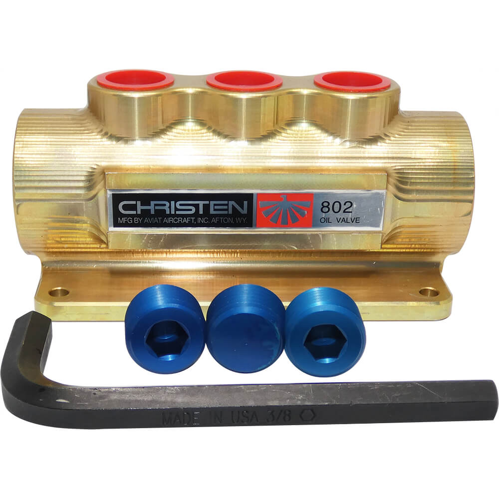 Note: Unit now comes in a gold cast finish, not in the epoxy white shown in the picture Christen 802 oil valve is a multiple port gravity operated ball valve. Cast aluminum w/textured white epoxy enamel finish & all internal steel parts are cadmium plated. Normally installed on firewall or engine mount. Designed for fittings to be installed at side, front or both. Req. 3 AN816-10D nipples for hose connection. Wt.1.75 lbs. installed. |