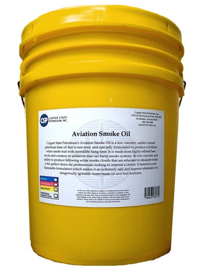 Copper State Petroleum's Aviation Smoke Oil is a low viscosity, amber colored petroleum base oil for many aviation smoke applications. It is non-toxic and specially formulated to produce a brilliant white smoke trail with incredible hang time.