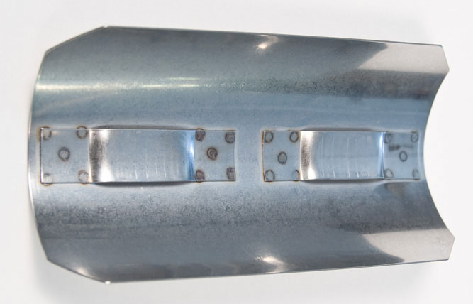 Over the years we have seen failure of the rivets that hold the exhaust heat shield to the mounting bracket. The solution was to spot weld the stainless steel mounting bracket to the stainless steel heat shield thus eliminating the possibility of rivet failure. Adding additional spot welds insures reliability. They are offered in two sizes, 2 inch and 4 inch to cover most applications. |