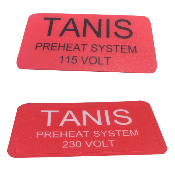 Placard for Tanis 115 or 230 Volt Systems Material Description: 0.010" thick velvet polycarbonate with a 0.005" thick permanent adhesive that is resistant to most aviation fluids. |
