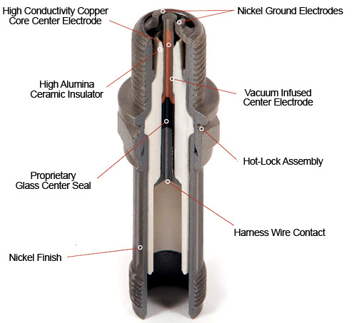 MASSIVE ELECTRODE SPARK PLUG Aviation Spark Plug With the most automated manufacturing processes and the most innovative spark plug in the aviation industry. Made in USA. High Conductivity Copper Core Center Electrode copper, co-extruded inside a nickel alloy sleeve ensures outstanding heat and electrical conductivity while the nickel sleeve offers high resistance to corrosive combustion gases. High Alumina Ceramic Insulator high mechanical strength, superior dielectric properties, proprietary protective glaze, provides high performance to conquer severe operational conditions. "Clean Collar" massive electrode "V" tip focuses heat to reduce fouling and enhance heat range control. Proprietary Glass Center Seal 21st century 'fired in' resistor replaces the multipart screw, spring, carbon pile stack up used in competitive plugs and known to suffer from resistance value instability that can cause misfires, wasted fuel, engine roughness. Nickel Finish environmentally preferable electrolytic nickel provides outstanding durable finish, superior corrosion protection, and extreme wear resistance. Nickel Ground Electrodes aviation grade nickel electrode design focuses on minimizing sparking voltage requirements while maintaining specification gaps to ensure large, stable 'flame kernels' for on-time ignition and complete combustion. Vacuum Infused Center Electrode proprietary, vacuum infusion process seals electrode/insulator gap providing stable heat range and superior center electrode cooling (heat flow to the insulator). Hot-Lock Assembly intense pressure and heat create positive, zero-leakage, shrunk in seal between insulator and shell to contain the hot, high pressure combustion cycle gases. Harness Wire Contact smooth, uninterrupted, oxide treated spring contact surface offers enhanced corrosion resistance, is chemically bonded to the fired-in resistor providing the ultimate harness/spark plug termination integrity and energy transfer. |